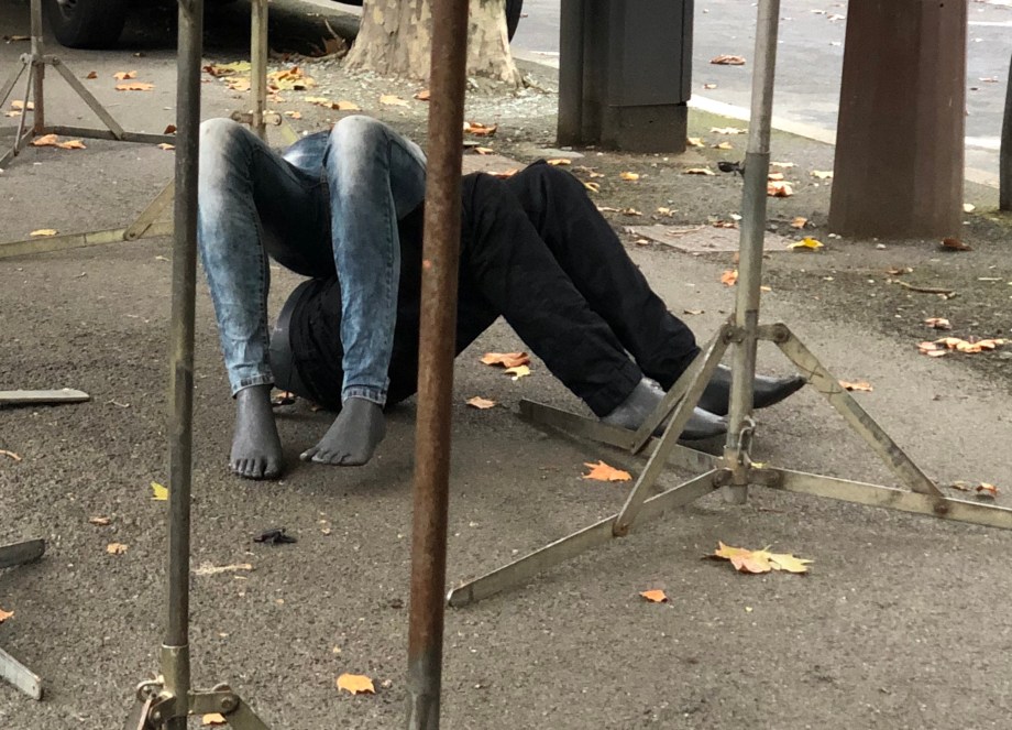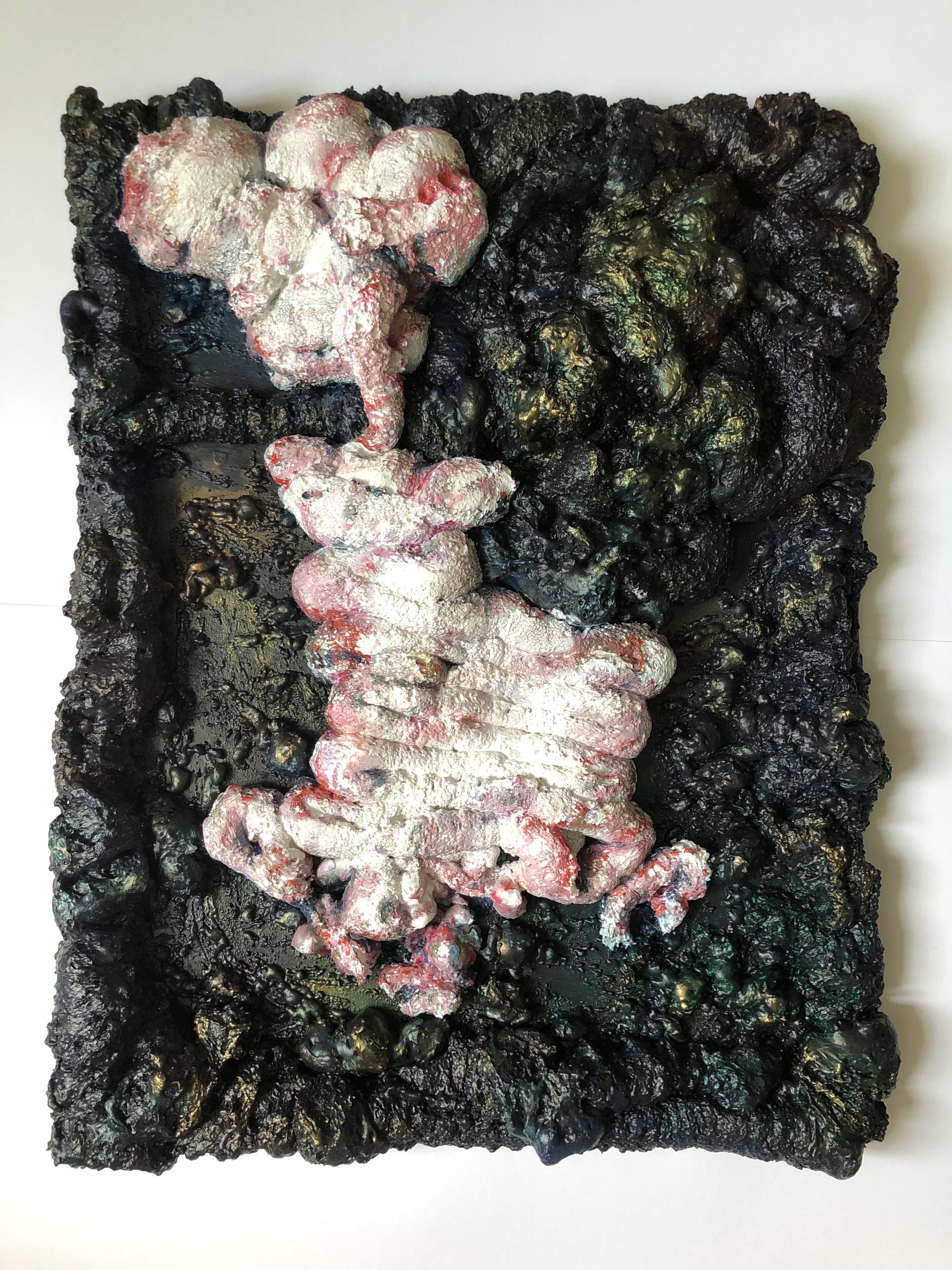 Acrylics, spray paint, expandable foam, frame, glass, 2019.
